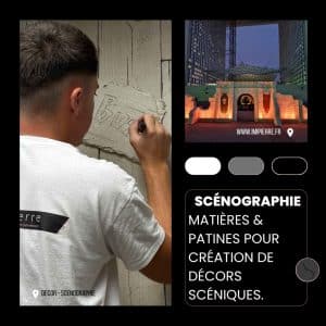 La thématisation (Décors à thème) & la scénographie, communication visuelle pour l’événementiel. Imitation de roche, bois, arches etc. magasins éphémères, commerces, décors de cinéma… Effets, matières et patines !